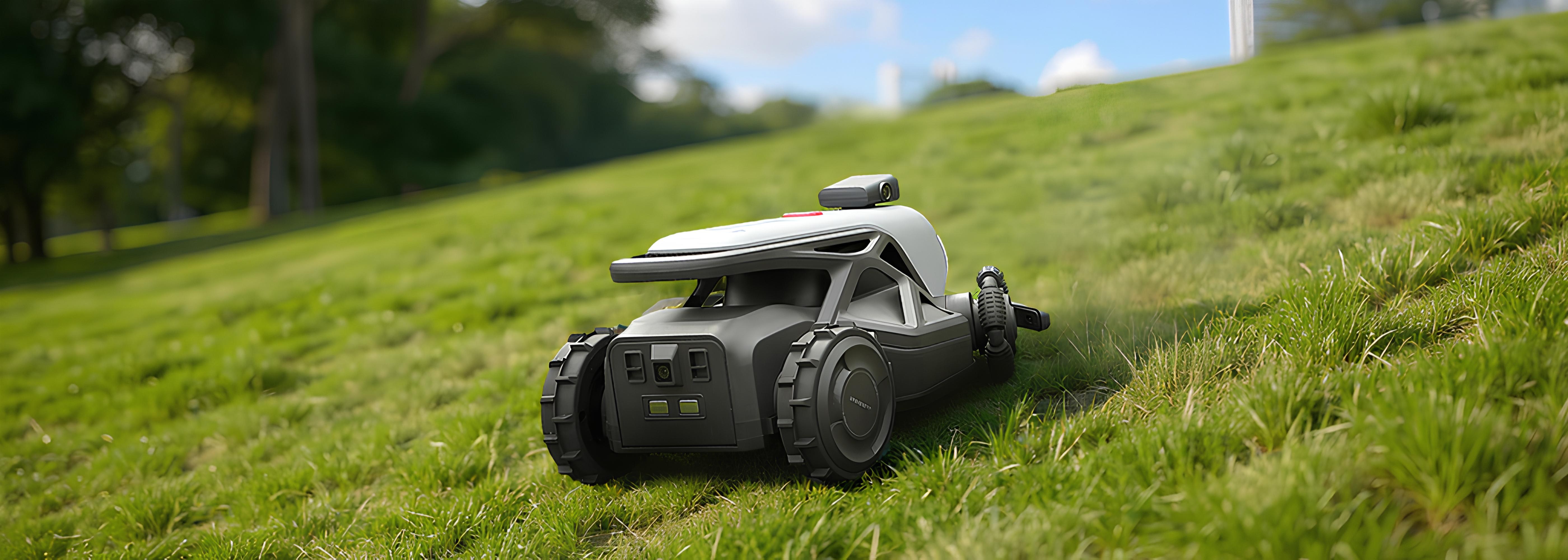 Dual hub motors and a high chassis let Tron tackle slopes up to 65% with precision and grip, handling uneven terrain effortlessly for smart, off-road mowing.